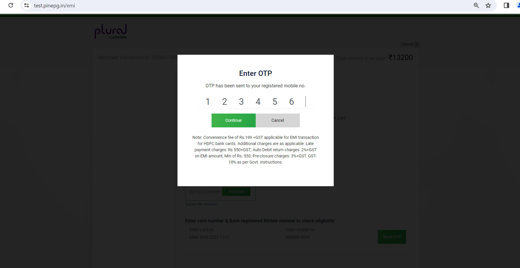 5). After entering card/mobile no. details, when clicked on Send OTP, a popup will open where 6 digit OTP needs to be entered.