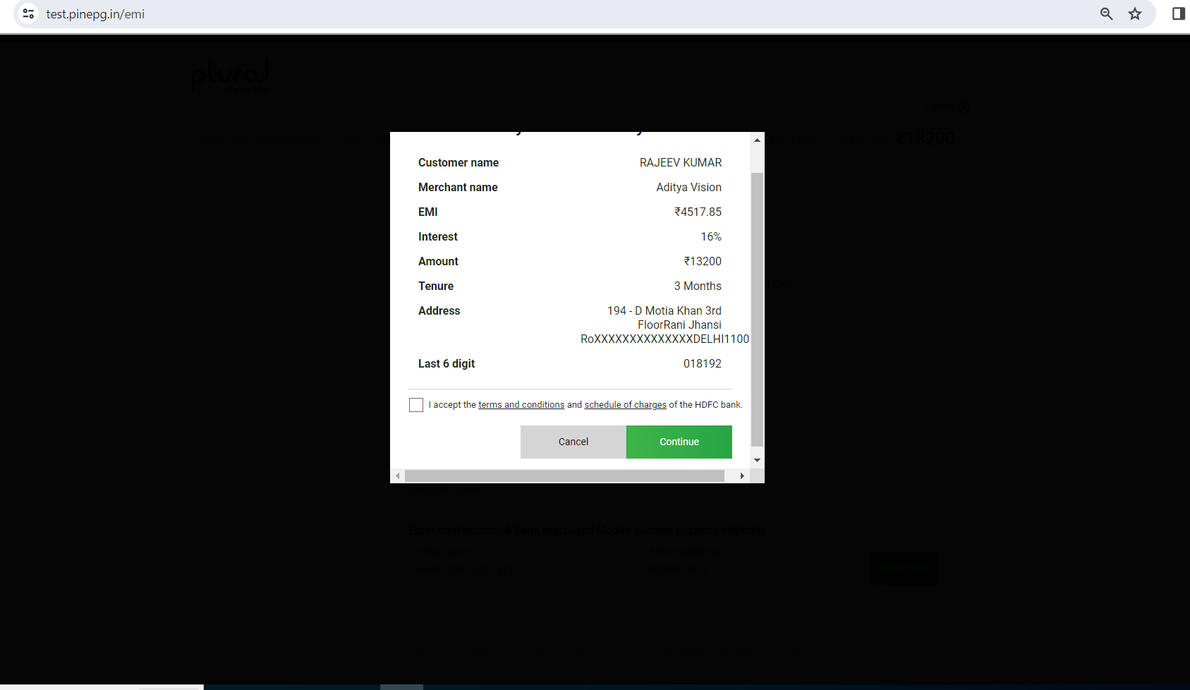 6). After entering OTP when clicked on Continue, it will open a popup where all Customer details are shown followed by checkbox to accept Terms and Conditions to complete the transaction.
